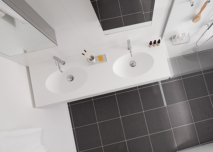 人工大理石製壁付洗面器本体、水栓本体2個、排水金物(プッシュ式)2個、ボトル型排水トラップ2個、止水栓4個